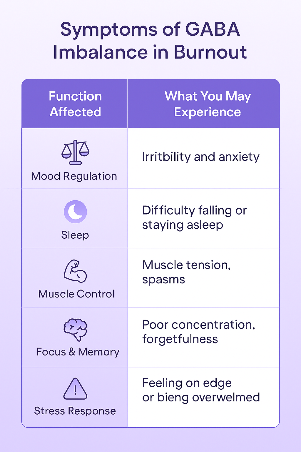 When GABA levels are low, the brain becomes overstimulated, leading to the classic “wired but tired” feeling of burnout.